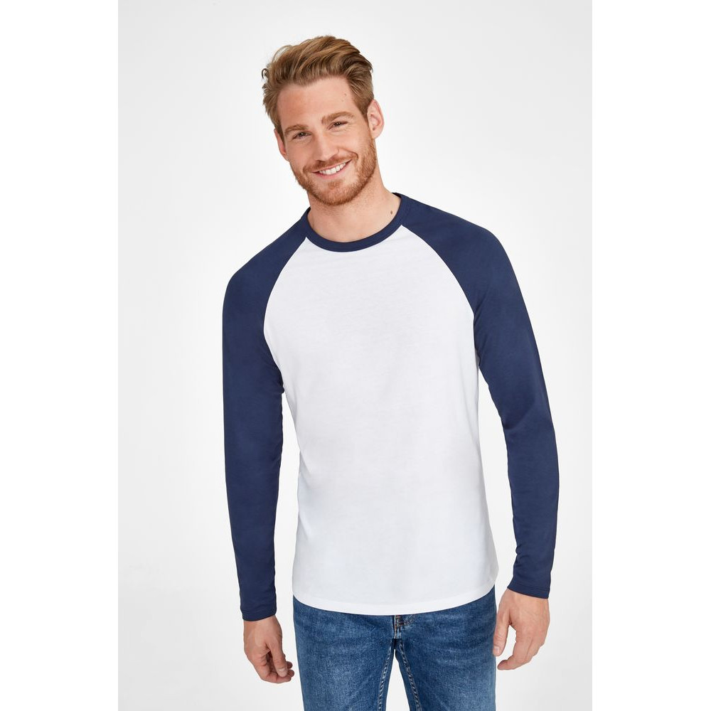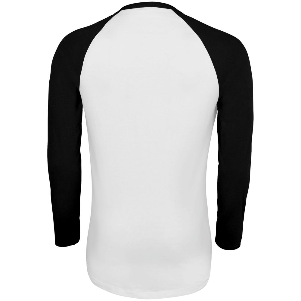 Мужская двухцветная футболка с боковыми швами, длинным рукавом реглан и закругленным низом.