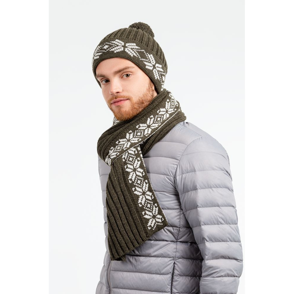 Выполнен с совмещением фактурной вязки и жаккардового узора.