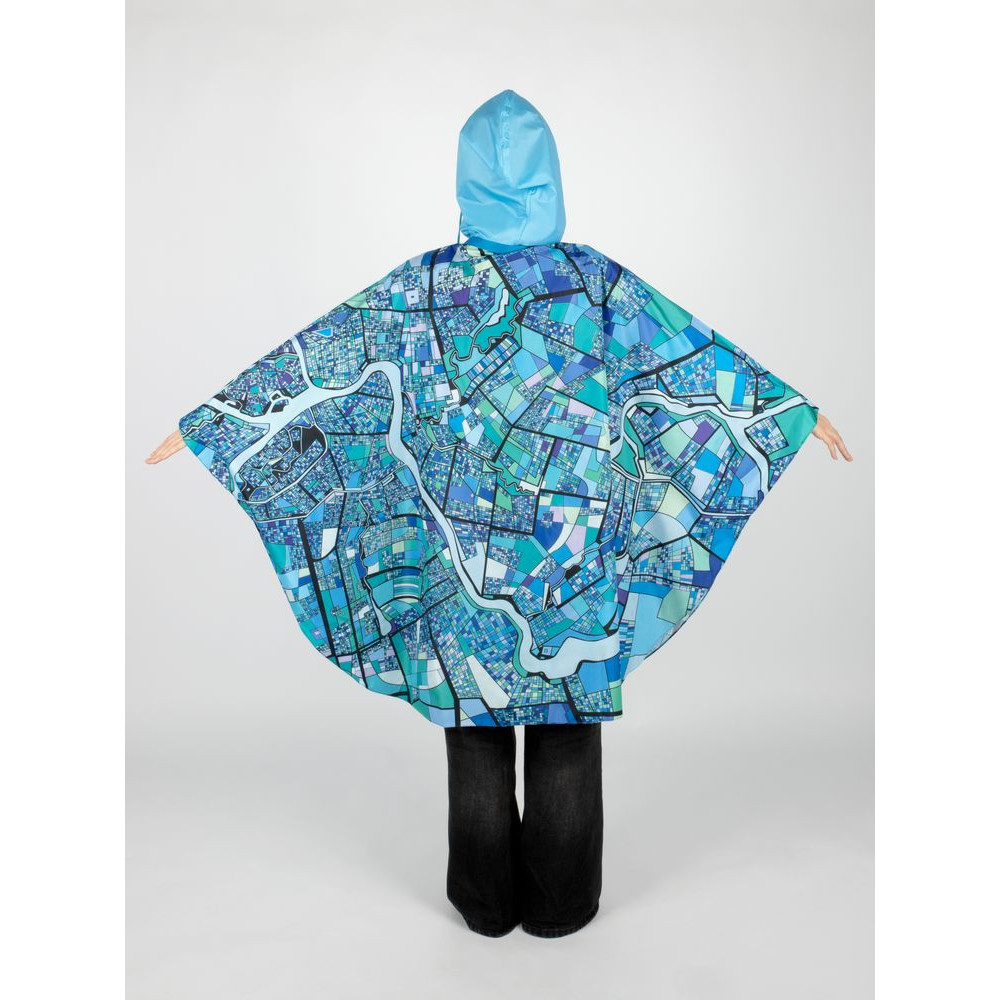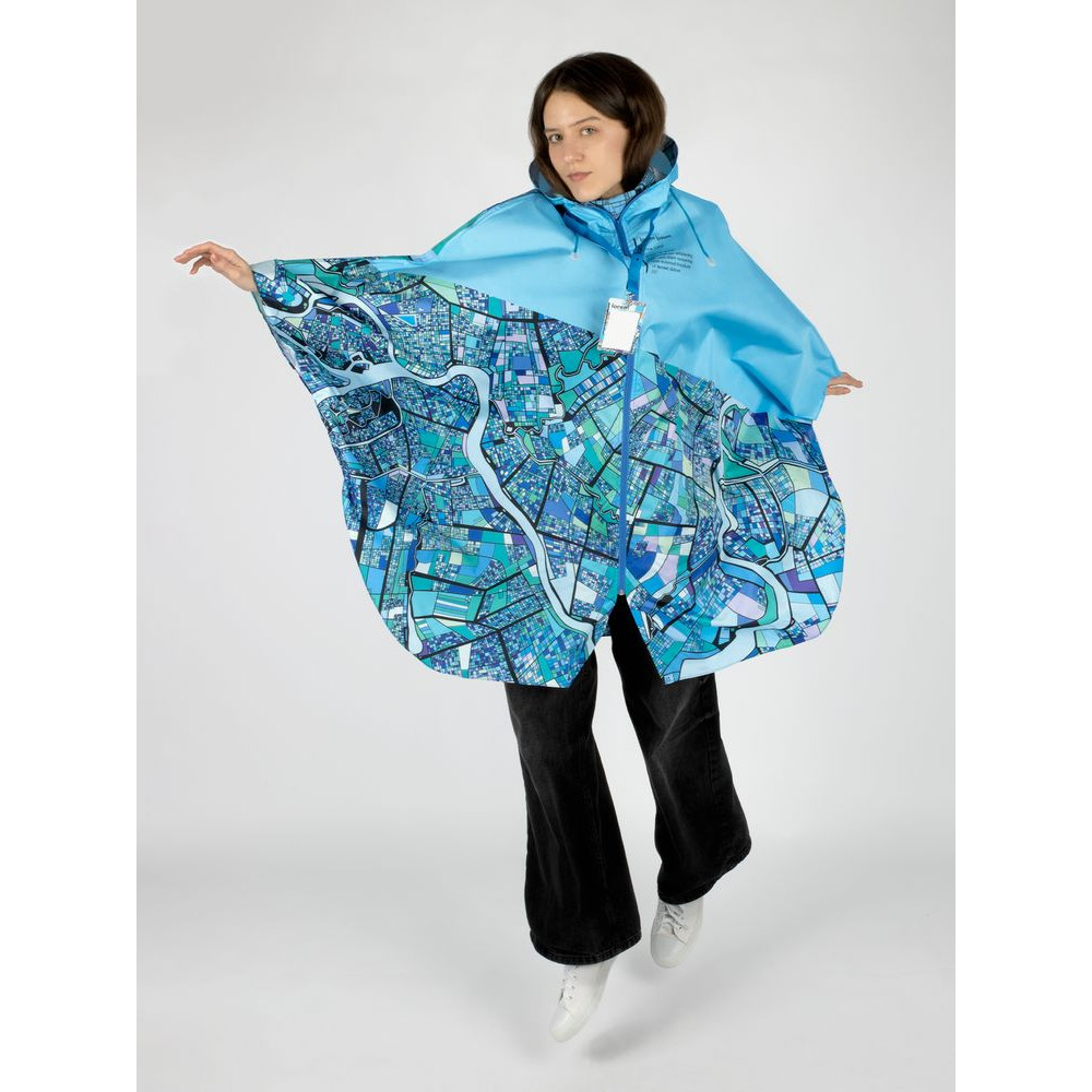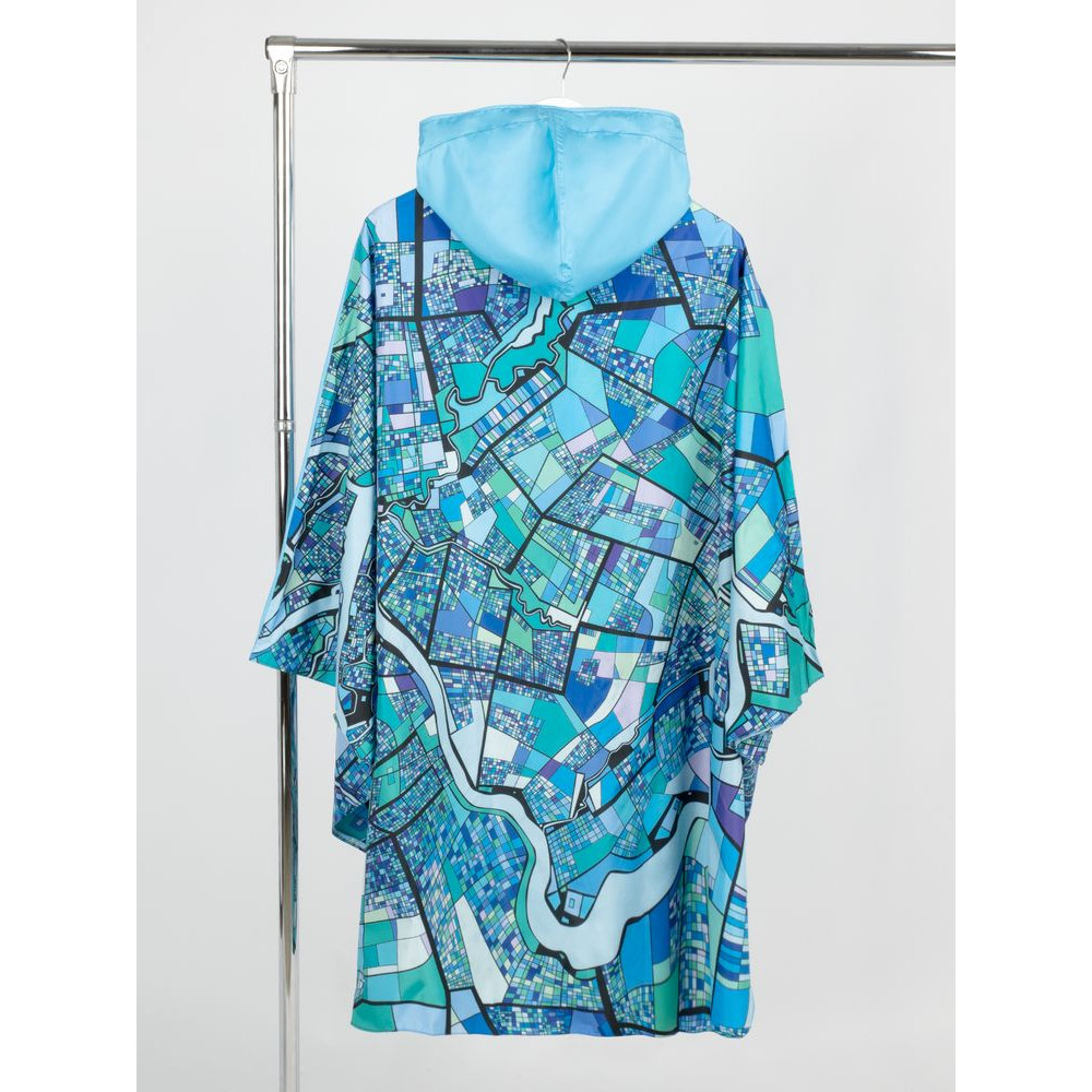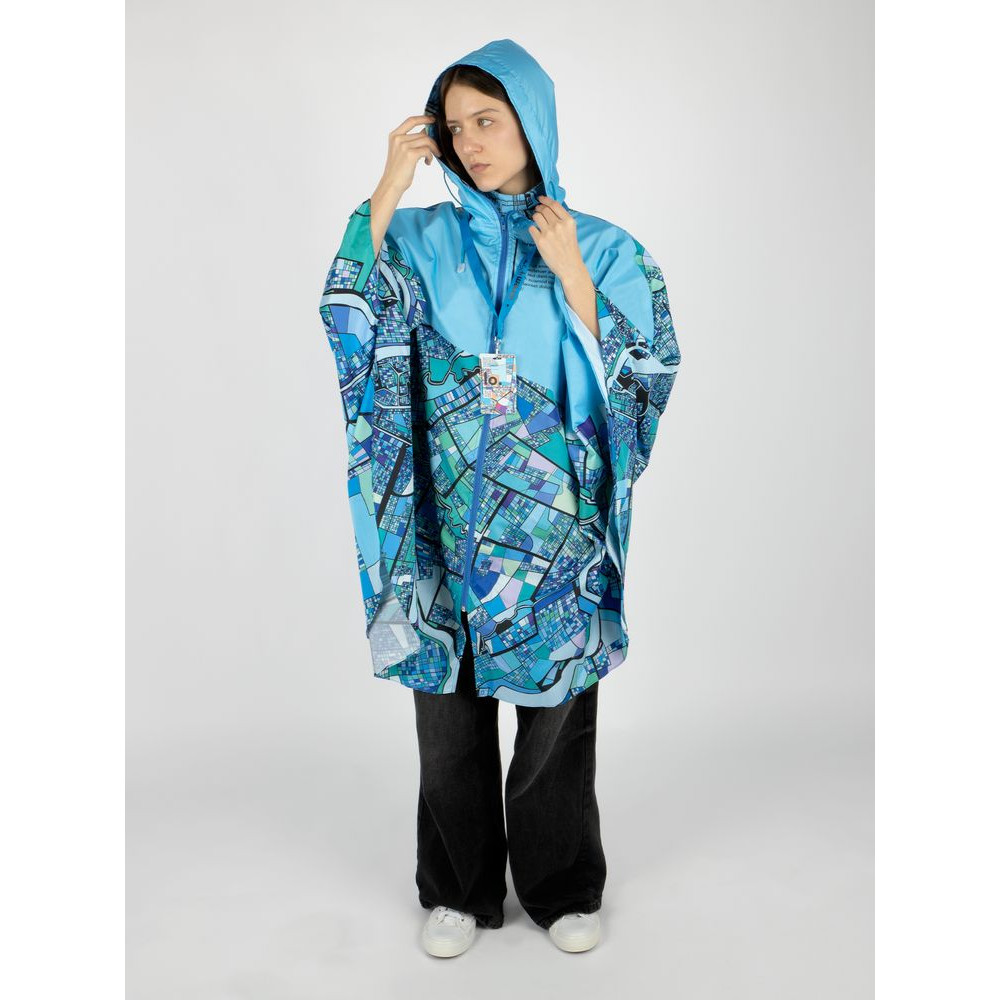 Легкий городской дождевик-пончо с регулируемым капюшоном из влагоустойчивого материала подходит для защиты в непогоду, свободно одевается поверх одежды и небольшого рюкзака.