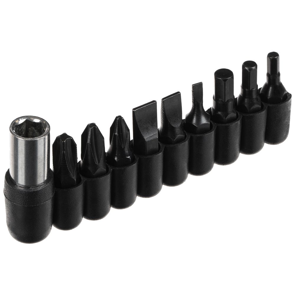 В комплекте мультитул, чехол и набор из 9 съемных бит.