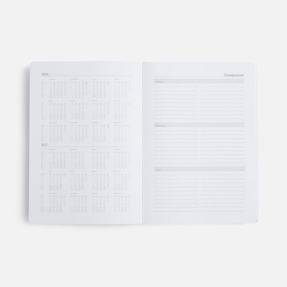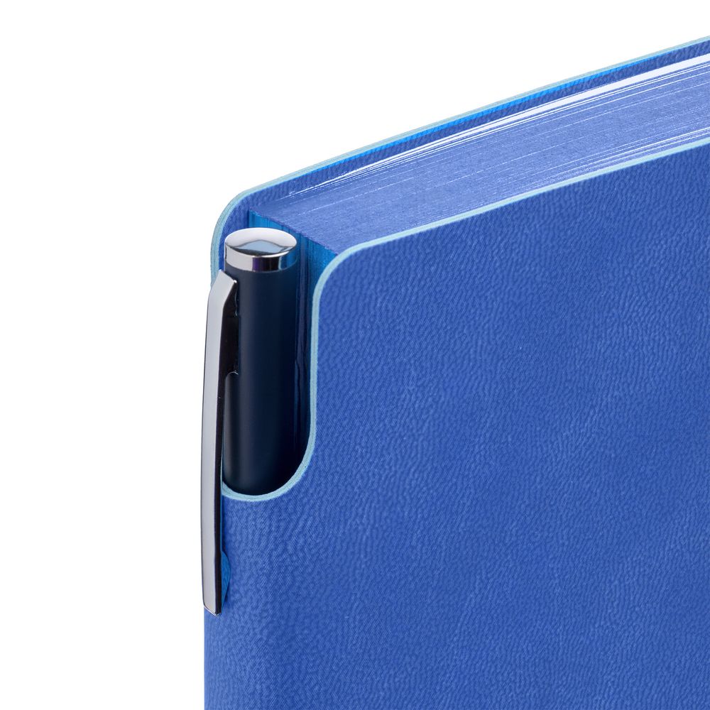Гибкая обложка ежедневника выполнена из материала Latte, синий НН. Внутри корешка — специальное место для крепления ручки размером до 15х0,9 см.