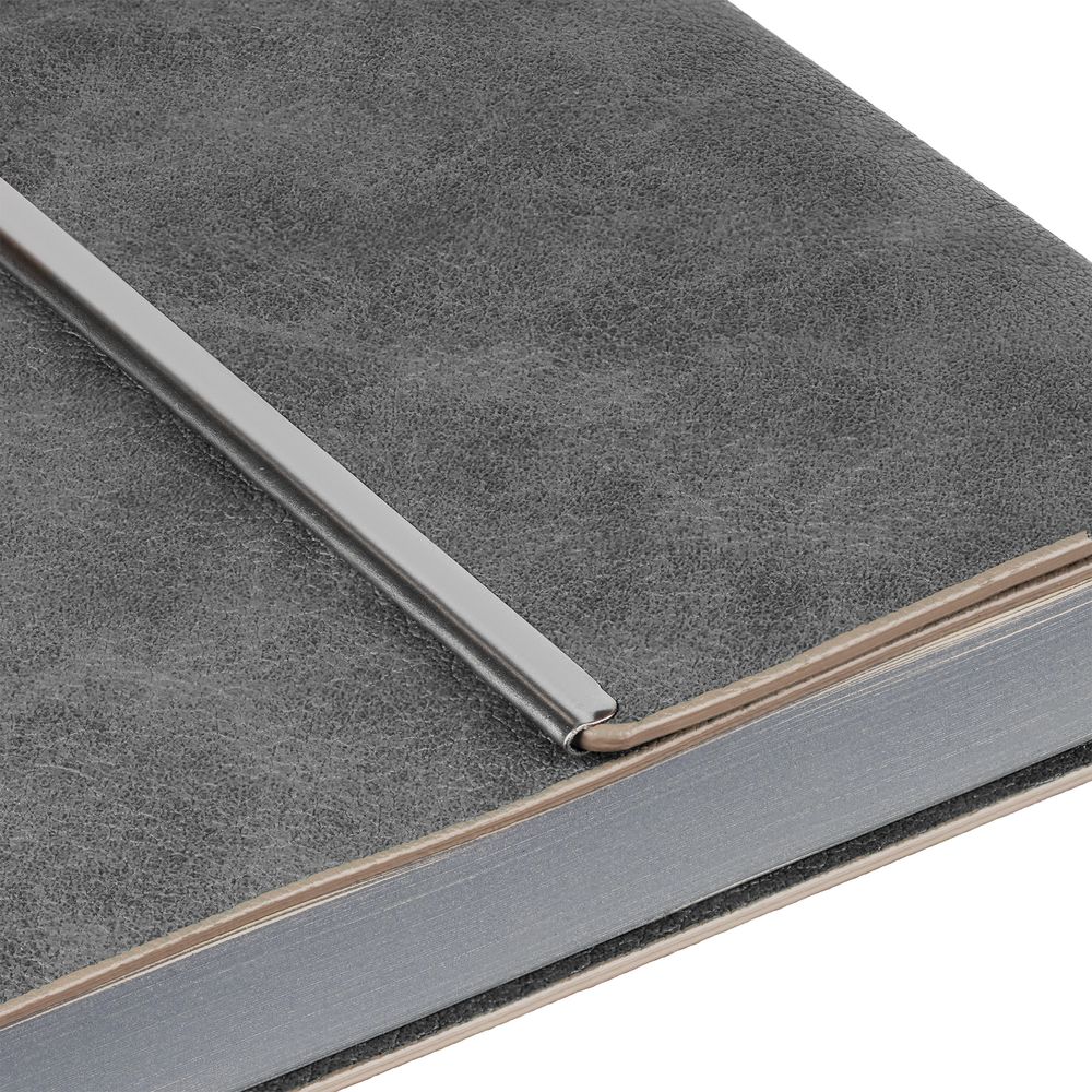 Ежедневник с гибкой обложкой, клапаном на магните и металлической отделкой клапана. Выполнен из материала Petrus, серый СС, дополнен серым ляссе.