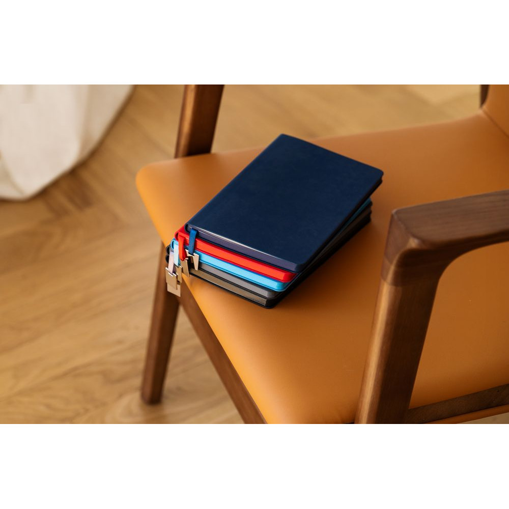Ежедневник с гибкой обложкой, выполнен из материалов Soft Touch Ultra, красный РР, и Latte, красный (внутренняя часть обложки), дополнен ляссе в цвет обложки с металлическим шильдиком.