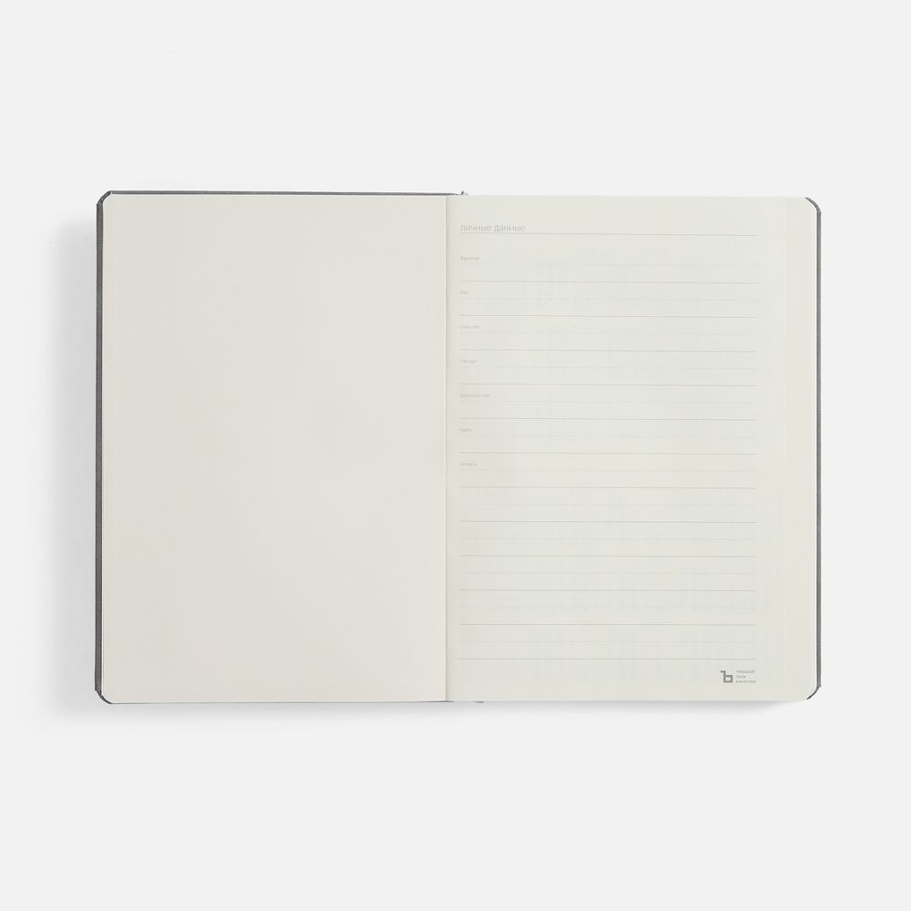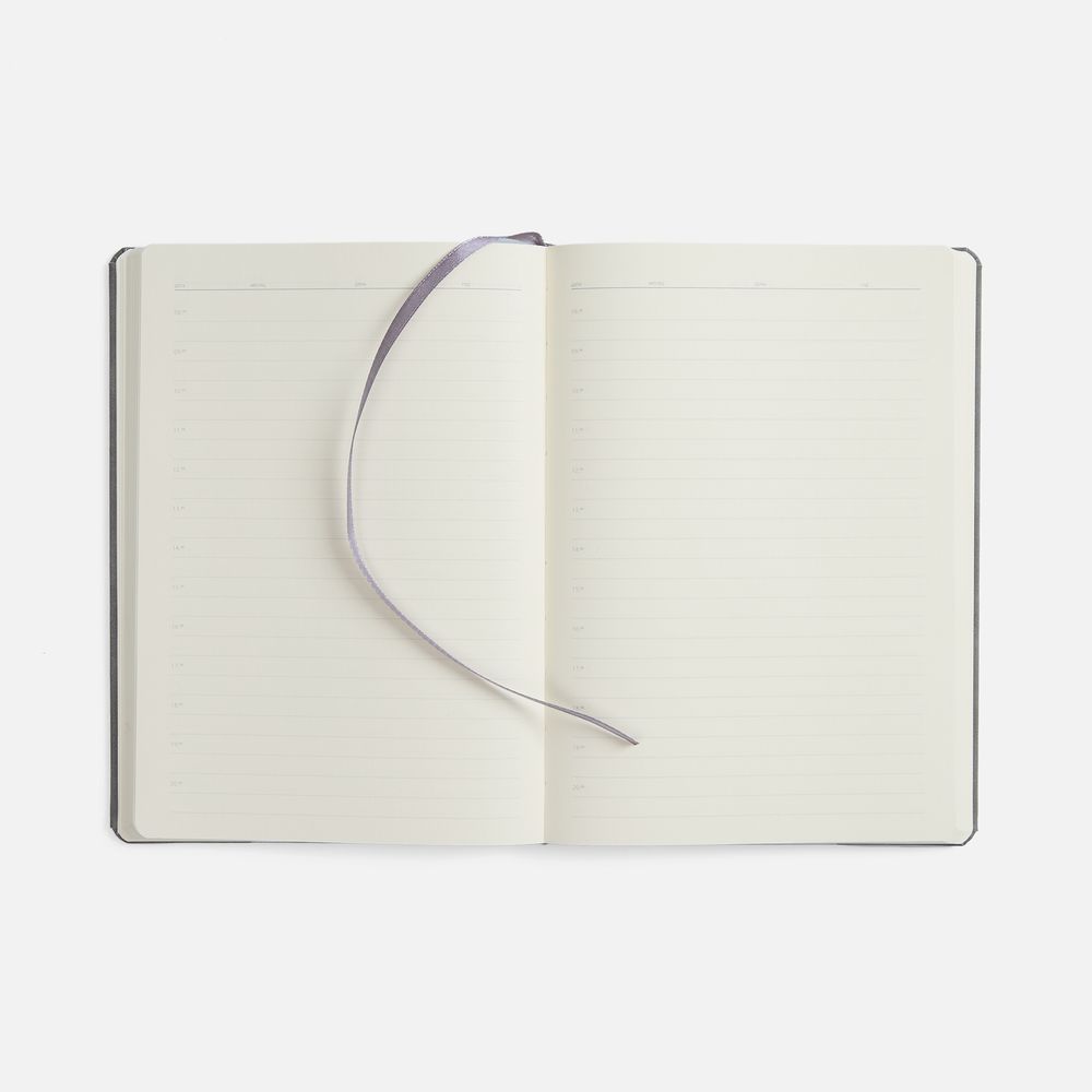 Ежедневник с твердой обложкой, выполнен из материала Nubuck Touch, серый СС, дополнен ляссе темно-серого цвета.