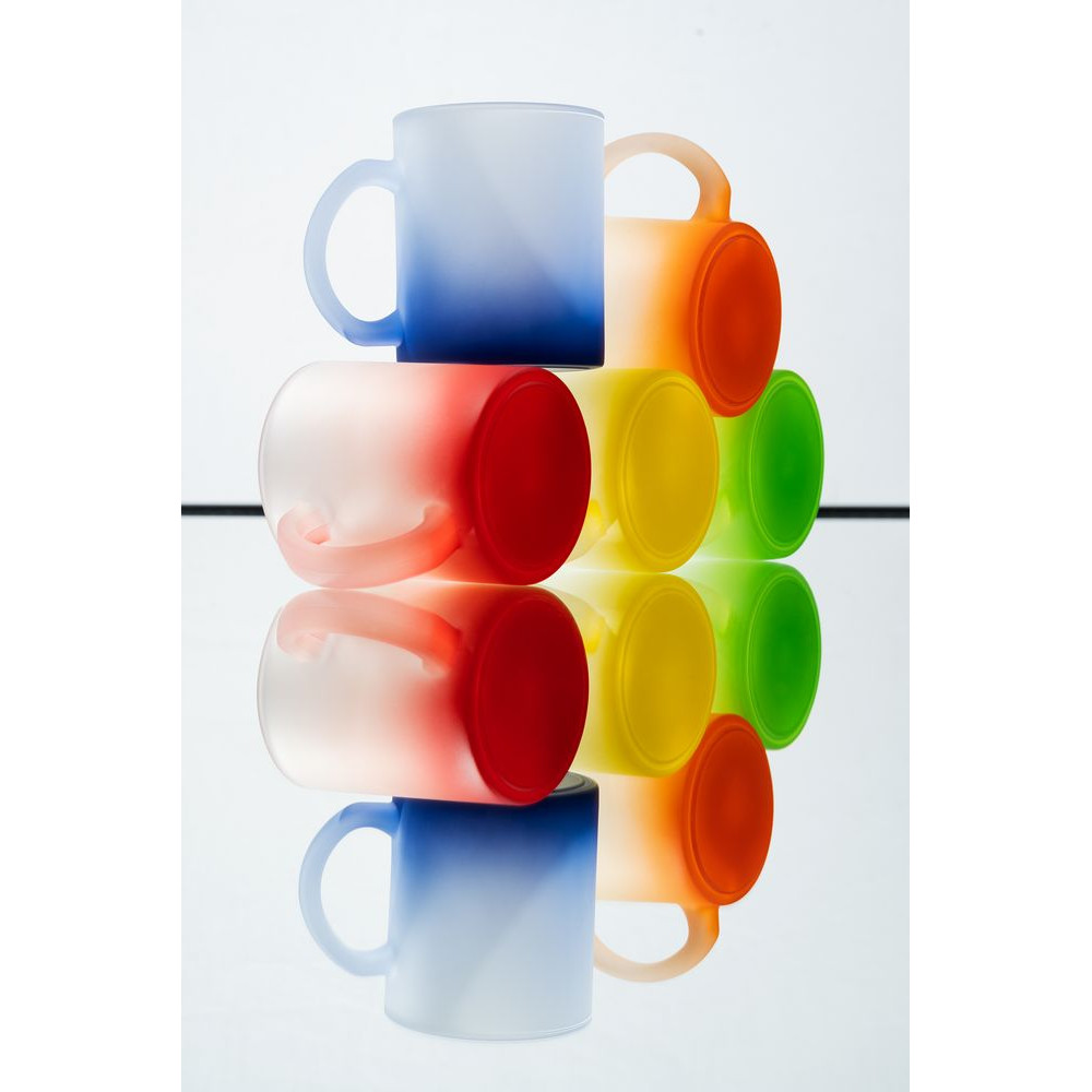 Яркая стеклянная кружка Grade Fade с эффектом омбре и плавным переходом цвета привлекает внимание оригинальным дизайном, а матовая поверхность приятна на ощупь. Подходит для сублимационной печати.